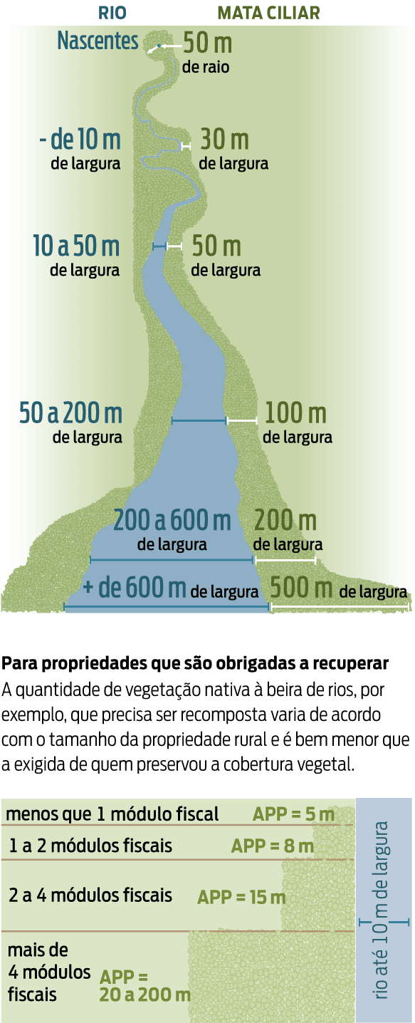 O novo Código Florestal estabeleceu exigências diferenciadas para propriedades que têm Área de Preservação Permanente (APP) preservada. Quem manteve a vegetação nativa é obrigado a conservá-la em proporções maiores que aqueles que terão de restaurar a cobertura vegetal que derrubaram.
